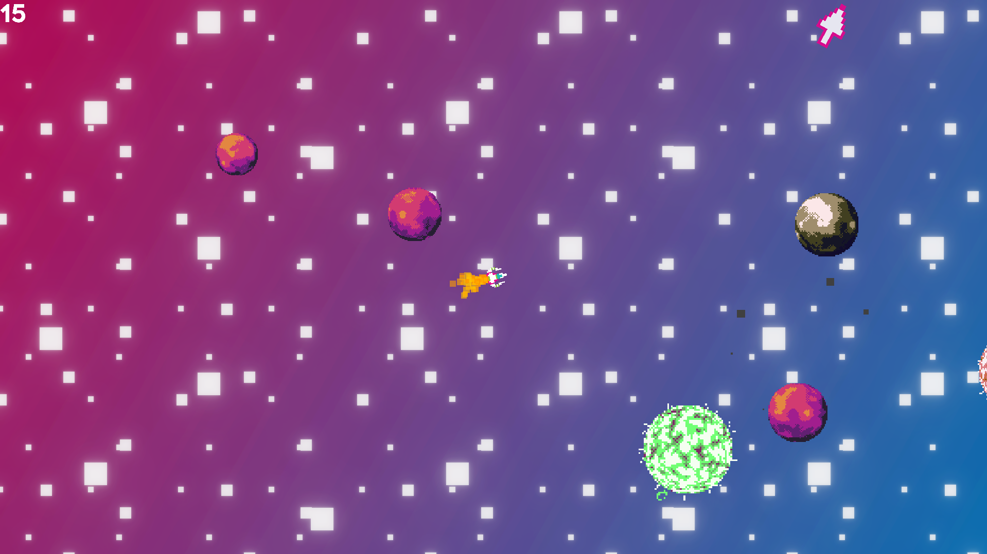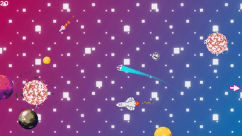 It was a little hard to figure out what to do and control the ship (controlling the ship might just be a skill issue on my part), but the flying around and hitting stuff is a lot of fun and the art is really nice (the parallax background is really cool too :D)!